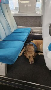 Tawa, 3 ans labrador sable, couchée dans le bus avec son dossard CIE